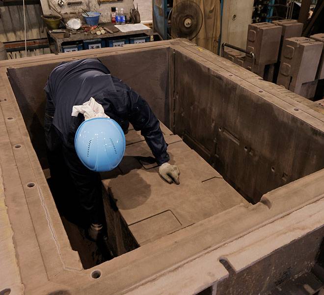 納めグループは、パズルのピースを組み合わせるように固めた砂を丁寧に組み上げます。熟練の職人技で複雑な型も正確に仕上げ、Kokuneのものづくりの土台を支えています。
