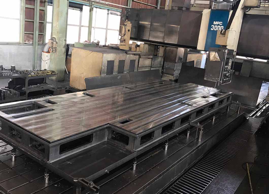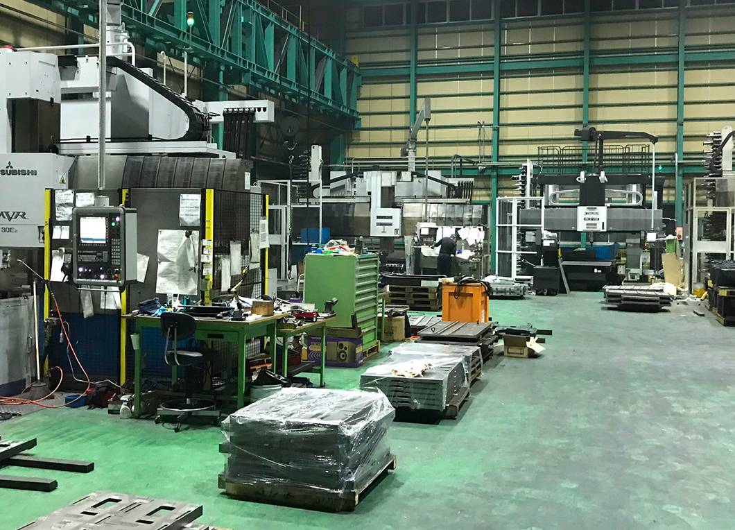 田島鐵工株式会社の強みは、大型部品から量産部品まで幅広く対応できる 総合的な加工体制にあります。門型五面加工機を複数保有しており、最大門幅3,050mm、ストローク長さ7,400mmの設備により、大型フレームや長尺ワークを高精度で加工できます。