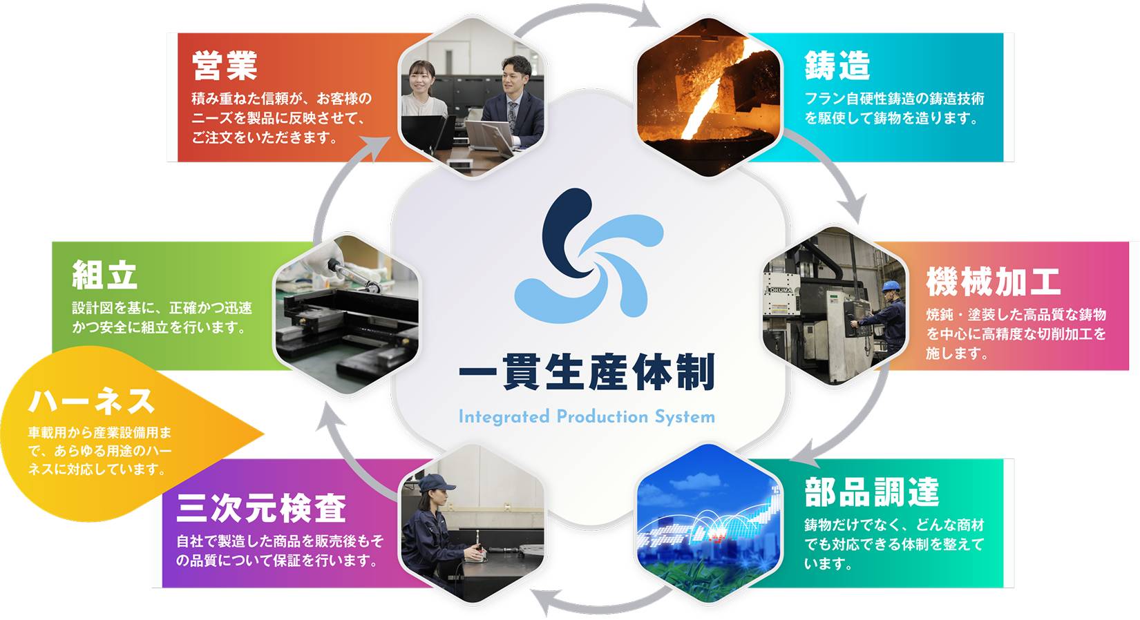 コア技術である鋳造製品の鋳造、機械加工を中心に各種部品調達から組立まで全てにおいて対応できる一貫生産体制を武器にQCDにおいてお客様のご期待にお応えしていきます。