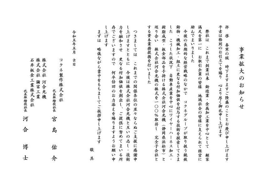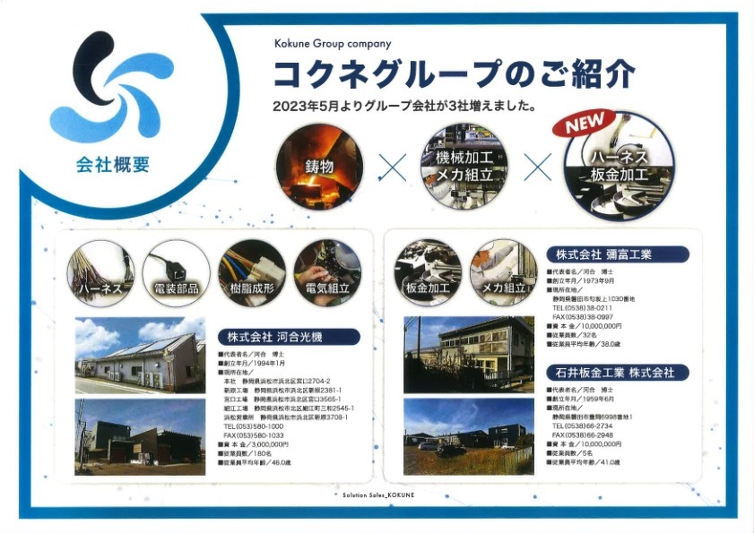 このたび、コクネ製作株式会社は、株式会社河合光機(静岡県浜松市)、株式会社彌富工業(静岡県磐田市)、石井板金工業株式会社(静岡県磐田市)の全株式を取得し、子会社化にいたしましたことをお知らせ致します。 皆様からのニーズに更にお応えできるよう努めてまいりますので、今後ともどうぞよろしくお願いいたします。 詳しくはこちらをご覧ください。
