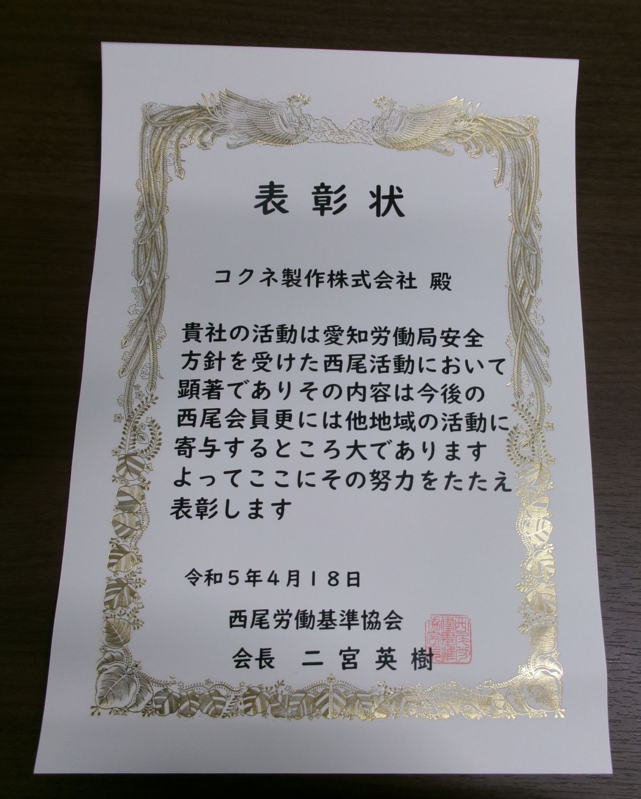 先日、西尾労働基準協会様の、『危なさと向き合おう』特別表彰式に出席させていただきました。 今後も安全第一で業務に取り組んでまいりますので、よろしくお願いいたします。