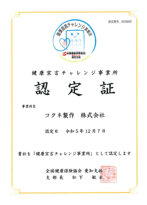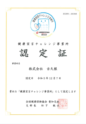 (株)古久根とコクネ製作(株)が、全国健康保険協会様より『健康宣言チャレンジ事業所』として認定を頂きました。 社員と社員の家族の皆様の健康増進に、積極的に取り組んで参ります。