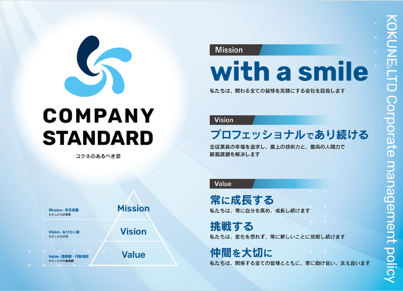 コクネグループは従業員一同この企業理念に則り、目指していく姿を強く意識して生産活動、地域貢献など様々なことに取り組んでいく所存でございます。