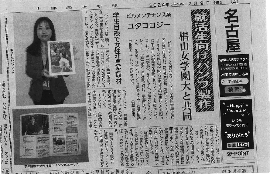 2月9日(金)の中部経済新聞に、昨年ユタコロジー様×椙山女学園大学様と協賛させていただき、弊社調達課のA.Yさんが取材を受けた『働きながら輝く女性になるための就活応援マガジン』の記事が掲載されました。 コクネ製作事務所にも数部置いてありますので、お立ち寄りの際は是非ご覧ください。