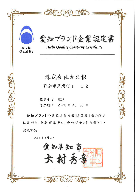 (株)古久根が愛知ブランド継続認定をいただきました。 今後も地球環境に配慮し、進化した鋳物づくりを行ってまいります。
