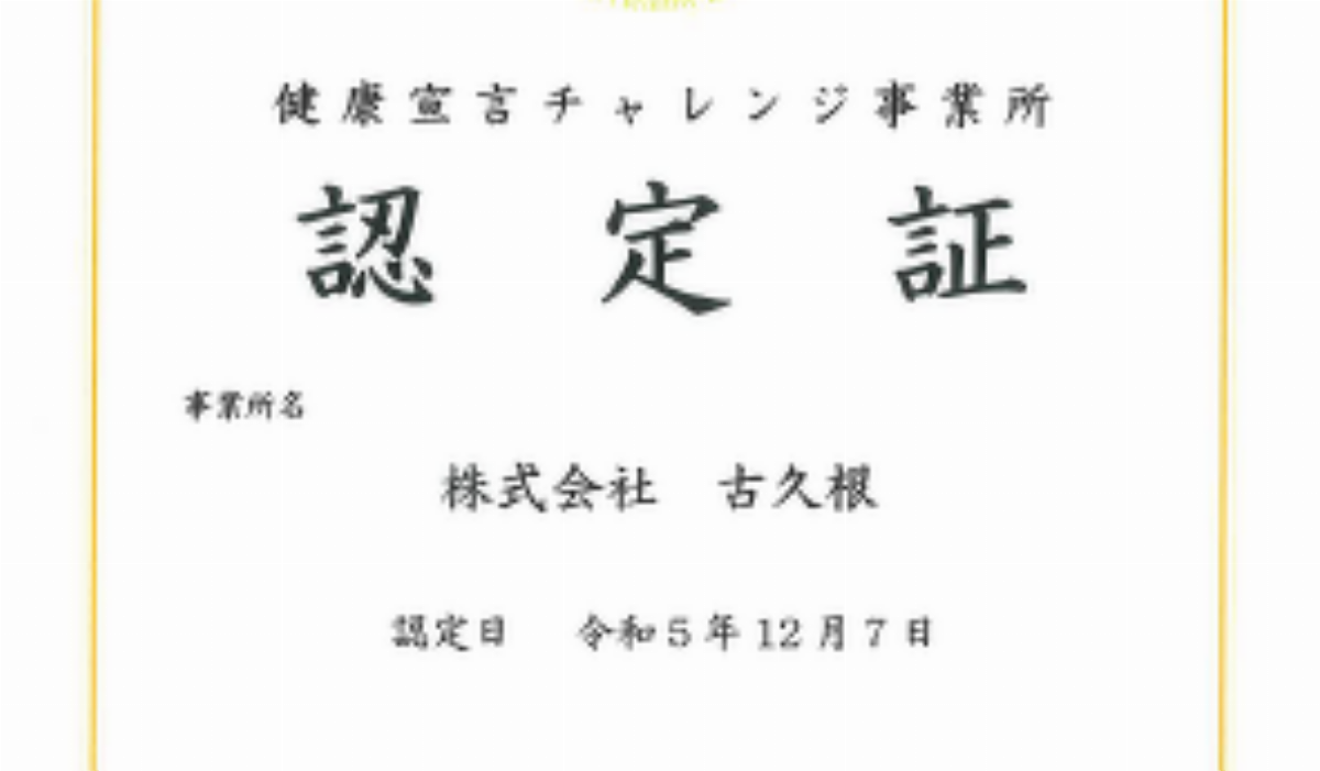 (株)古久根とコクネ製作(株)が、全国健康保険協会様より『健康宣言チャレンジ事業所』として認定を頂きました。 社員と社員の家族の皆様の健康増進に、積極的に取り組んで参ります。