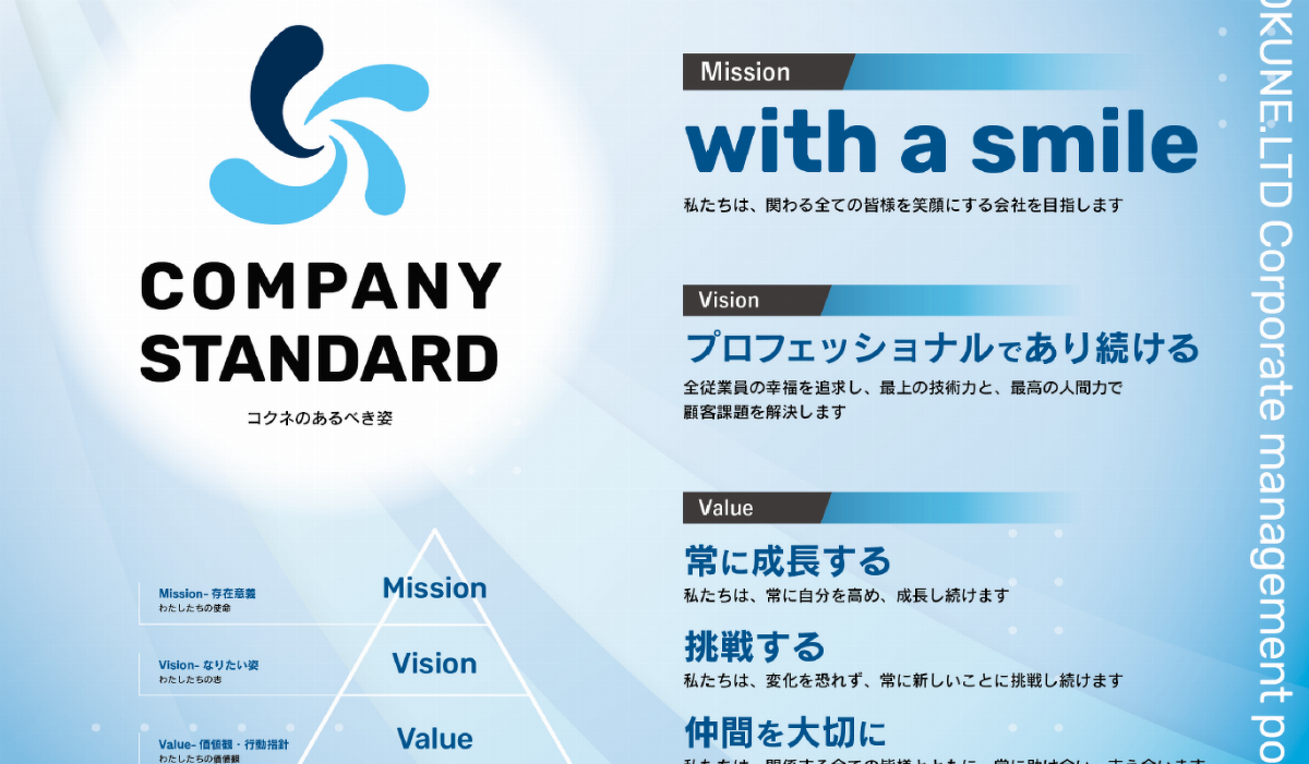 先日の合同式典にて社長より新しい企業理念の発表がありました。 新しい企業理念は、M(Mission)、V(Vision)、V(Value)の3つを軸にして従業員全員の意見を基に考えられたものです。...