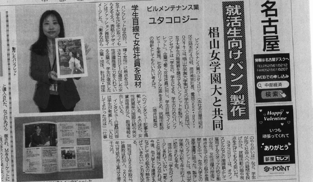 2月9日(金)の中部経済新聞に、昨年ユタコロジー様×椙山女学園大学様と協賛させていただき、弊社調達課のA.Yさんが取材を受けた『働きながら輝く女性になるための就活応援マガジン』の記事が...