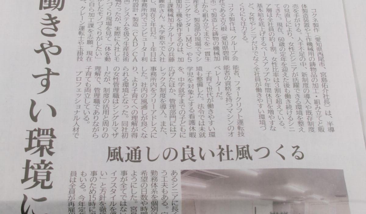 3月23日の日刊工業新聞にコクネ製作(株)が掲載されました! 働きやすい職場環境を整えるために行っている、様々な取り組みを書いていただきましたので、是非ご覧ください。