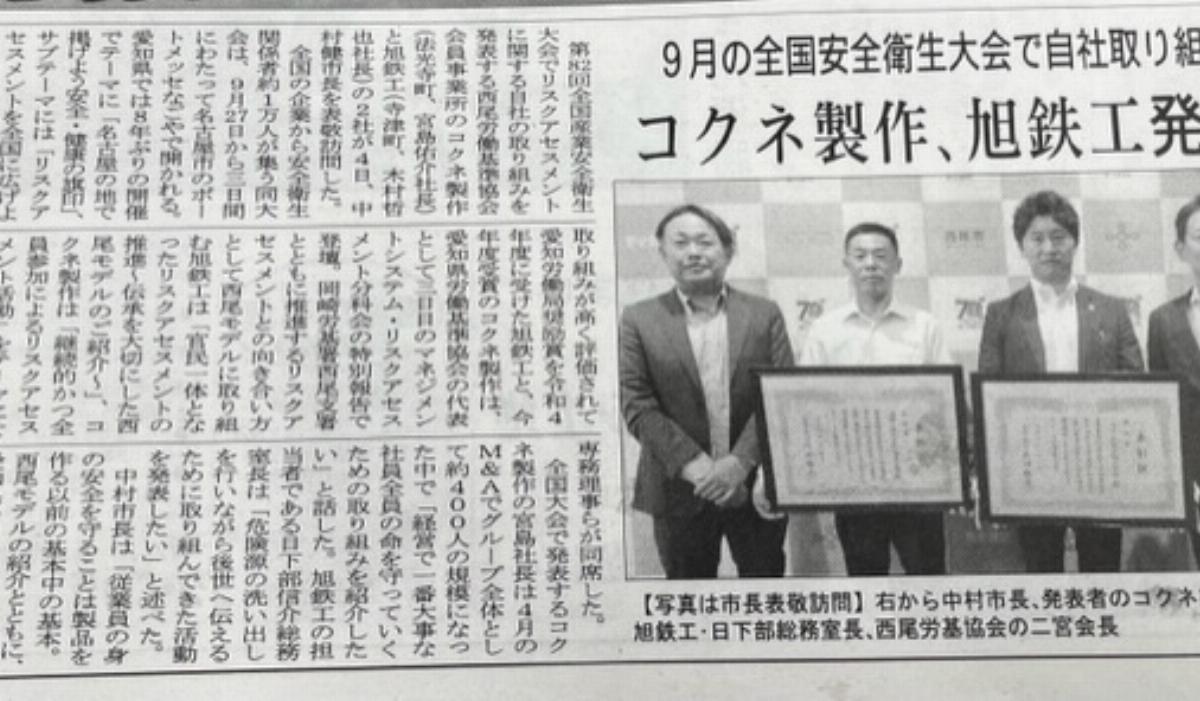 7月6日発行の愛三時報にコクネ製作(株)が掲載されました。 9月27日からポートメッセなごやにて開催の『第82回全国産業安全衛生大会』でリスクアセスメントに関する取り組みを発表するにあた...