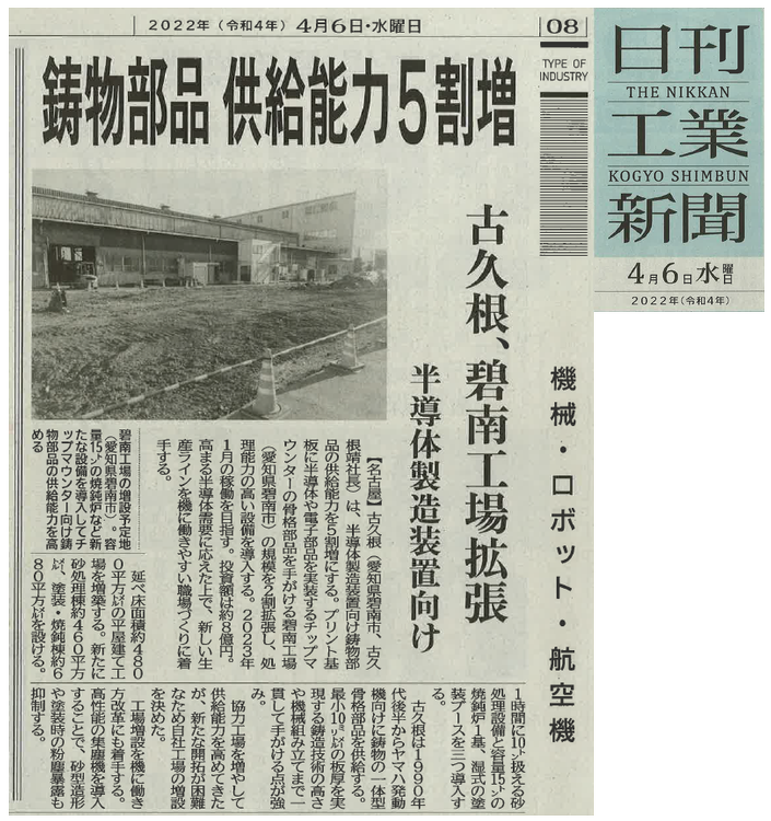 先日古久根専務が取材を受け、4月6日に発行された日刊工業新聞(全国版)の機械・ロボット・航空機のコーナーに、(株)古久根の工場拡張に関する記事が掲載されました。添付記事を是非ご覧ください。