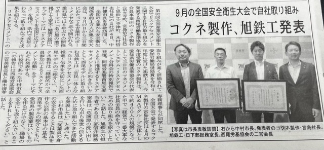 7月6日発行の愛三時報にコクネ製作(株)が掲載されました。 9月27日からポートメッセなごやにて開催の『第82回全国産業安全衛生大会』でリスクアセスメントに関する取り組みを発表するにあたり、中村健市長を表敬訪問させていただきました。
