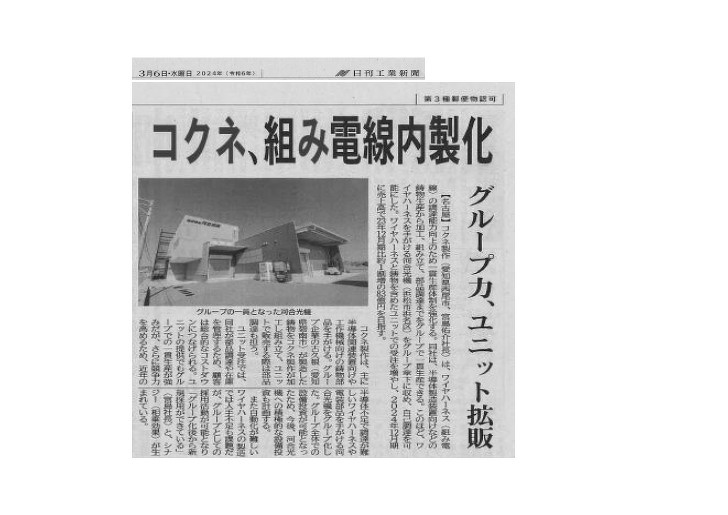 3月6日水曜日の日刊工業新聞「機械・ロボット・航空機」のページに、コクネ製作(株)のグループ会社(株)河合光機とのグループ化について掲載されました。