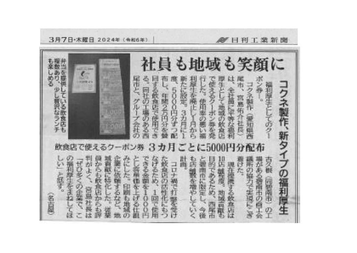 3月7日(木)の日刊工業新聞に西尾商工会議所と碧南商工会議所、またご提携いただけました地域店の皆様方のご協力で発行されました、福利厚生クーポン券の記事が掲載されました。