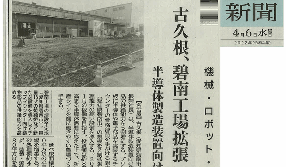 先日古久根専務が取材を受け、4月6日に発行された日刊工業新聞(全国版)の機械・ロボット・航空機のコーナーに、(株)古久根の工場拡張に関する記事が掲載されました。添付記事を是非ご覧く...